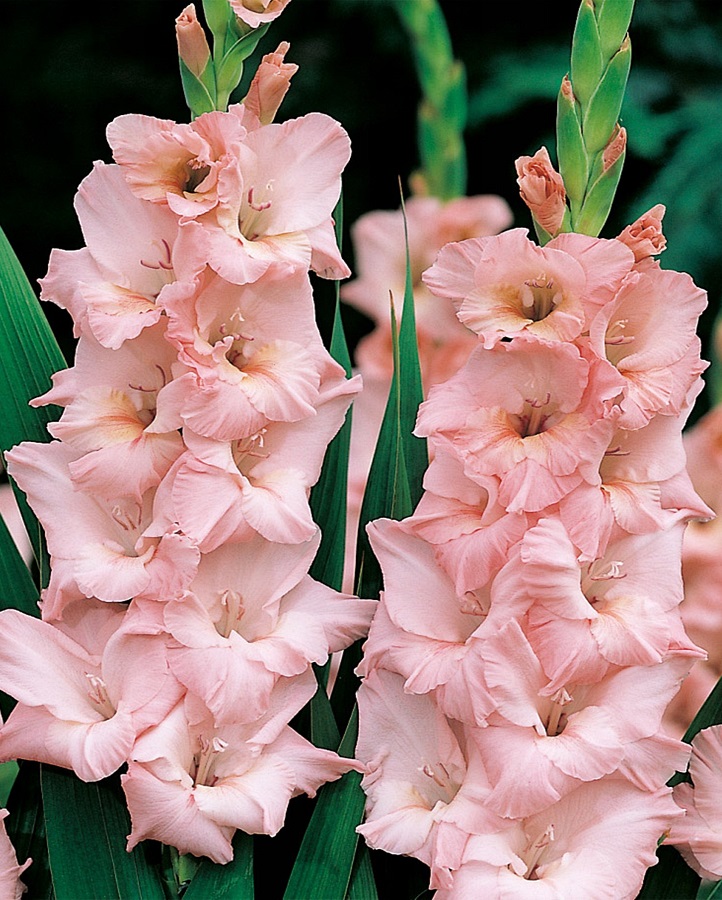 Гладиолус крупноцветковый Бен Венуто – расцветает с июля по сентябрь, образуя очаровательно крупные цветы нежно-оранжевого цвета с отливом персикового оттенка. Лепестки нежные гофрированные, при роспуске диаметром 15-18 см. На продолжительности цветения 2-3 недели, гладиолус источает слабый, тонкий аромат. Высота очаровательного гладиолуса Бен Венуто 110-130 см, из них соцветие-колос 40 см. Листья узкие, длинные, темно-зеленого оттенкаЦветы красиво смотрятся как в срезке, так и для оформления цветника.