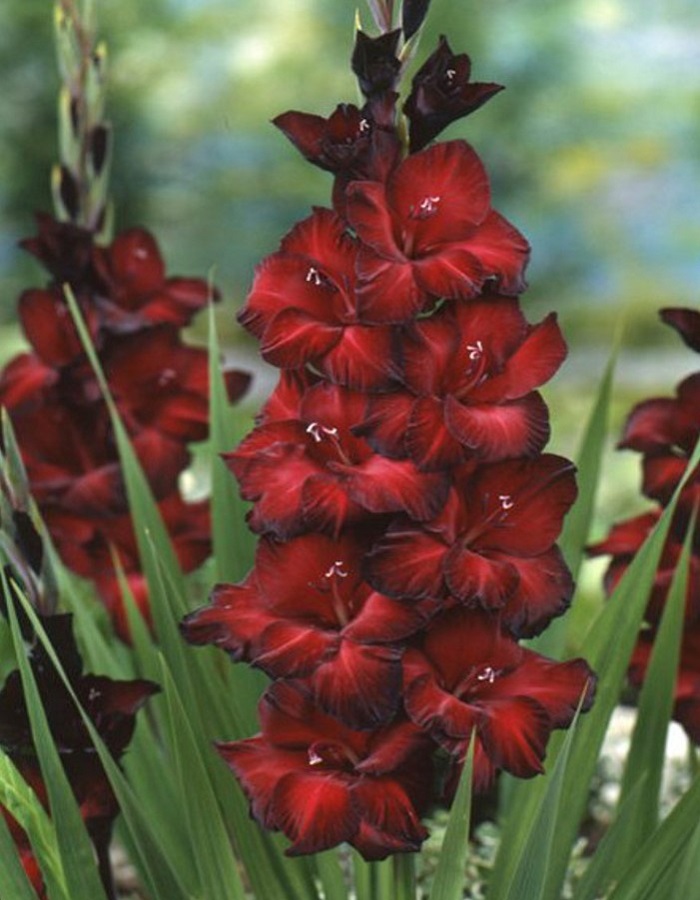 Гладиолус – высотой до 120 см. Листья зеленые, узкие, длинные с заостренным концом. Цветок крупный и пышный, диаметр 10 см. Цветок насыщенный темно-красный с пурпурным оттенком и темными кончиками. Место посадки солнечное, защищенное от сквозняков.
