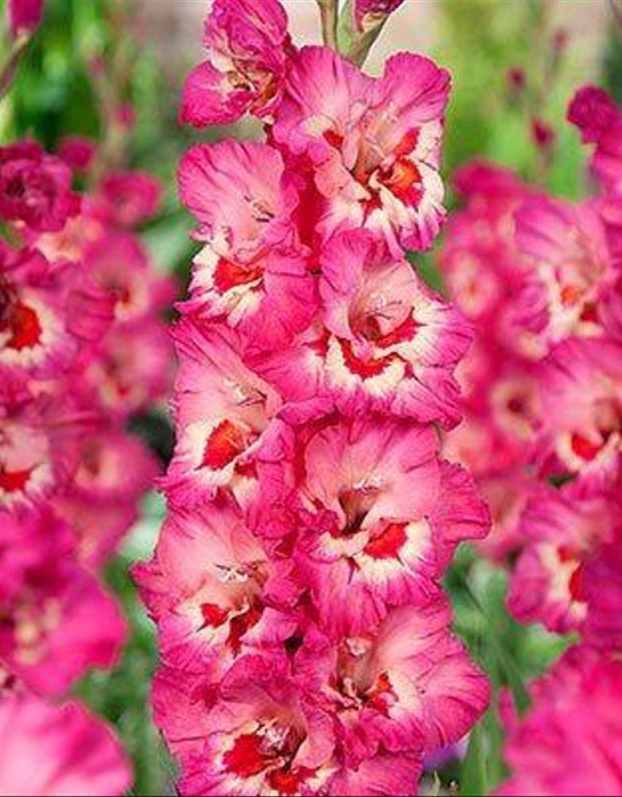 Гладиолус крупноцветковый гофрированный Вандохла – растение высотой 110-130см. Имеет вертикальный неветвящийся стебель и линейные листья. Привлекает внимание крупными и пышными ярко розовыми цветками с малиновым мазком, диаметром 12-14см, собранными в вертикальные соцветия. Элегантный и величественный гладиолус Вандохла станет фаворитом сада на исходе лета.