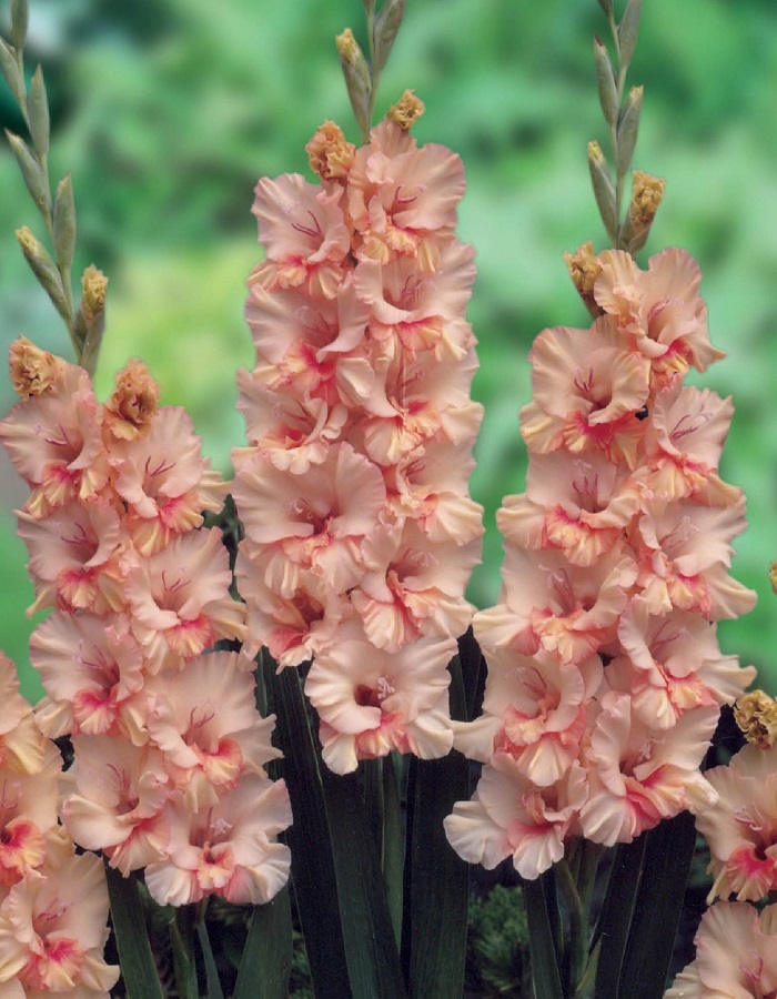 Гладиолус крупноцветковый гофрированный Кисси Раффл -— растение высотой 100 см. Имеет вертикальный неветвящийся стебель и линейные листья. Привлекает внимание крупными пышными гофрированными нежно-персиковыми цветками с редкими красными штрихами, диаметром до 12 см, собранными в вертикальные соцветия. Элегантный и величественный гладиолус Кисси Раффл станет фаворитом сада на исходе лета.