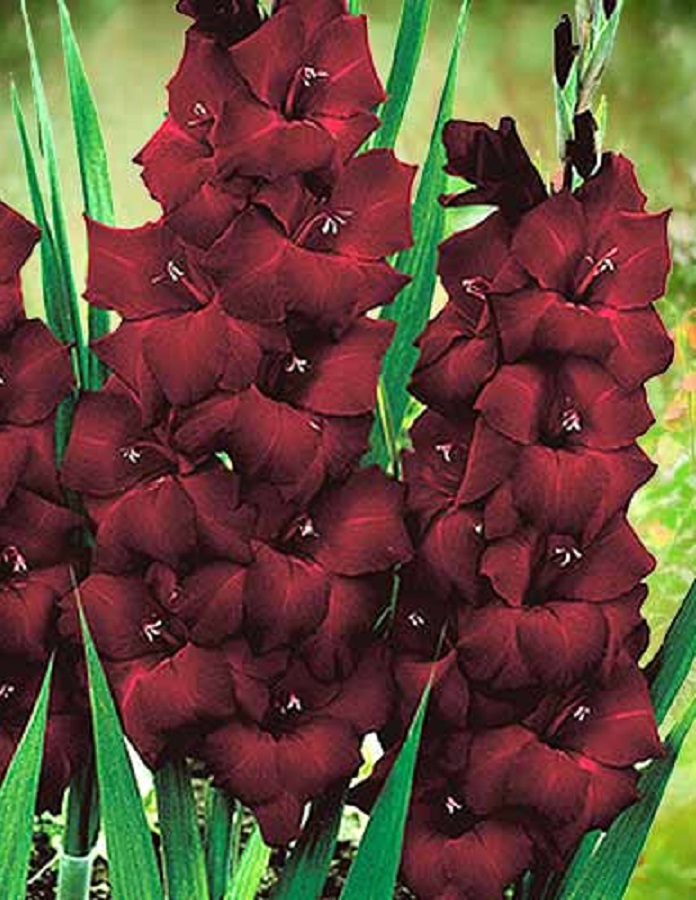 Гладиолус крупноцветковый Бургунди - растение высотой 90-110 см. Имеет вертикальный неветвящийся стебель и линейные листья. Привлекает внимание крупными и пышными бордовыми цветками, диаметром до 12 см, собранными в вертикальные соцветия. В соцветиях может быть до 28 цветков. Элегантный и величественный гладиолус Бургунди станет фаворитом сада на исходе лета.