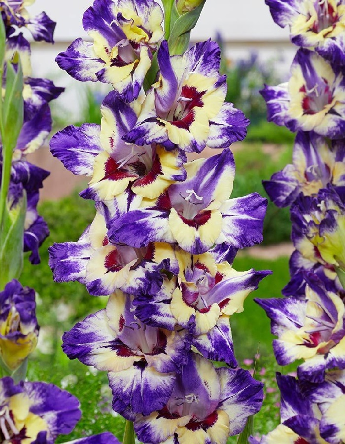 Крупноцветковый сорт гладиолуса Циркус Колор подарит вашему саду праздничное настроение. Яркие цветы с атласными лепестками имеют сложный окрас: сливочный в середине с широкой фиолетовой каймой и ярким винным мазком на нижних лепестках. Чем дольше цветок находится в раскрытом состоянии, тем светлее становится сливочный окрас, преходя пректический в белый. Сорт настолько яркий, что не требует к себе каких-то компаньонов, поэтому отдайте предпочтение монопосадке. Высота растения достигает 100-120 см, половина из которых приходится на цветонос. Гладиолусы предпочитают солнечные участки защищенные от ветра. Растениям требуется подвязка.