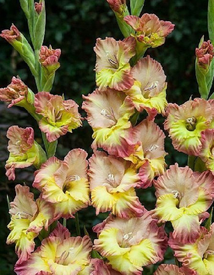 Гладиолус крупноцветковый Вольер Фриззл – растение высотой до 100 см. Имеет вертикальный неветвящийся стебель и линейные листья. Текстура цветков гладиолусов Вольер Фриззл удивляет, они словно вырезаны из кожаных лоскутков. Гофрированные лепестки отличаются по цвету: три лимонных и один телесно-розовый, все очерчены бледно-винной окантовкой диаметром до 12см, собранными в вертикальные соцветия. Элегантный и величественный гладиолус Вольер Фриззл станет фаворитом сада на исходе лета.