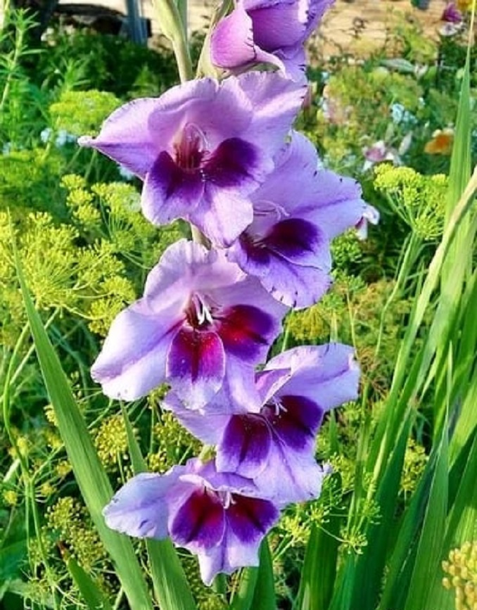Гладиолус крупноцветковый Бонос Мемори – высокорослый сорт семейства Ирисовых с пурпурно-сиреневыми цветками. Нарядные крепкие стебли поднимаются почти до высоты человеческого роста. На них последовательно – с июля до октября распускаются очаровательные бокаловидные цветки. Мощь и силу гладиолуса подчеркивают широкие мечевидные листья.