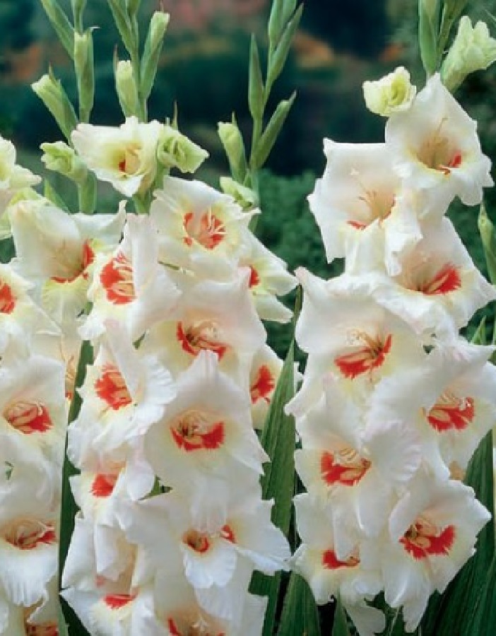 Гладиолус баттерфляй Мессина – растение высотой 90см. Имеет вертикальный неветвящийся стебель и линейные листья. Привлекает внимание крупными и пышными бело-кремовыми цветками с красным пятном, диаметром до 14см, собранными в вертикальные соцветия. Элегантный и величественный гладиолус Мессина станет фаворитом сада на исходе лета.