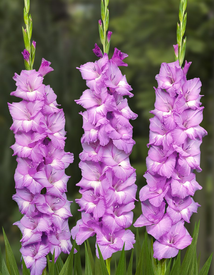 Гладиолус Медитерран вызывает восхищение у цветоводов и эстетов. Высокий, достигающий 1 м, прямой стебель укутан зелеными мечевидными листьями. Цветонос, занимающий половину стебля, усыпан очаровательными светло-сиреневыми бутонами и цветками. Имеющие более темный фиолетовый оттенок у основания, слегка гофрированные лепестки в центре словно бледнеют, а по краю вновь ставятся яркими. Крупные цветки, диаметром до 14 см, радуют своим цветением с июля по сентябрь. Идеально сочетаются с цветами ярких, теплых расцветок, на фоне которых смотрятся особенно нежно.