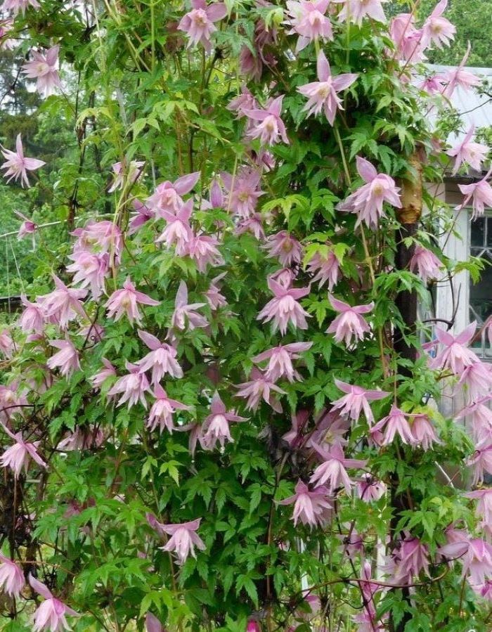 Применение,особенностиРастение служит для создания живых изгородей, украшения беседок, пергол. Возможно придание лиане любой формы.КустРастение в виде лианы, имеющее тонкие побеги длиной до 3 м,ЛистьяЛистья культуры ярко-зеленые, тройчатые, супротивные.Цветы/соцветияЦветки складываются из 4 эллипсообразных, вытянутых, остро заканчивающихся со слегка волнистыми краями чашелистиков, на внешней стороне кремово-розовыми, снизу светло-розовые, иногда почти кремового цвета. В середине цветка находится 15-17 стаминодий такой же длины, как и чашелистики, иногда более короткие, ланцетообразные, слегка волнистые,остро законченные.Внешние стаминодии такого же цвета, как и чашелистики, к середине все более светлые. Тычинки с желтыми пыльниками на кремовых нитях и кремовыми пестиками. Цветет с конца мая по июль, повторно в августе, Группа обрезки 2Возраст саженца1 годУсловия выращиванияОчень важно хорошо укрыть побеги на зиму.Группа обрезки2