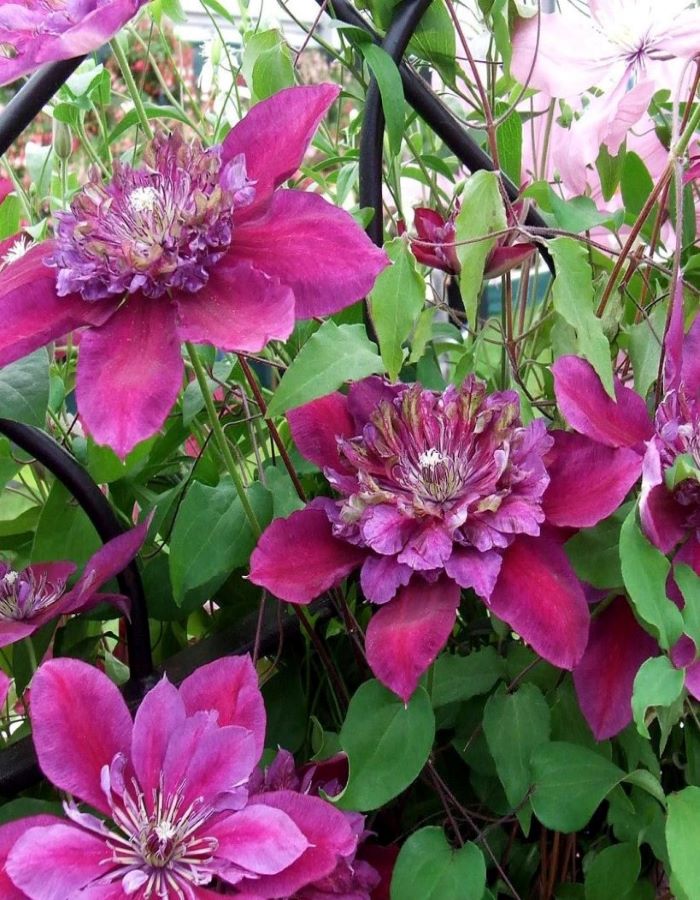 Применение,особенностиЦепляется за опоры листовыми черешками. Используется для посадки у беседок, пергол, решёток, сеток и других садовых опор. Особенно хорош для выращивания в небольших садах и контейнерах.КустМноголетняя лиана, достигающая в высоту до 1,5-2 м.Цветы/соцветия. Имеет махровые цветки пурпурно-розового цвета, которые в диаметре становят до 8-10 см.Возраст саженца1 годУсловия выращиванияВыращивать можно при невысоких оградах, сетках, решётках и других садовых опорах. Может подниматься по натуральных опорах таких как хвойные и листовые кусты или по растениям не требующих обрезку. Любит освещённые места. В местах очень солнечных, жарких цветки выгорают быстро отцветают. Можно выращивать в контейнерах.Группа обрезки2