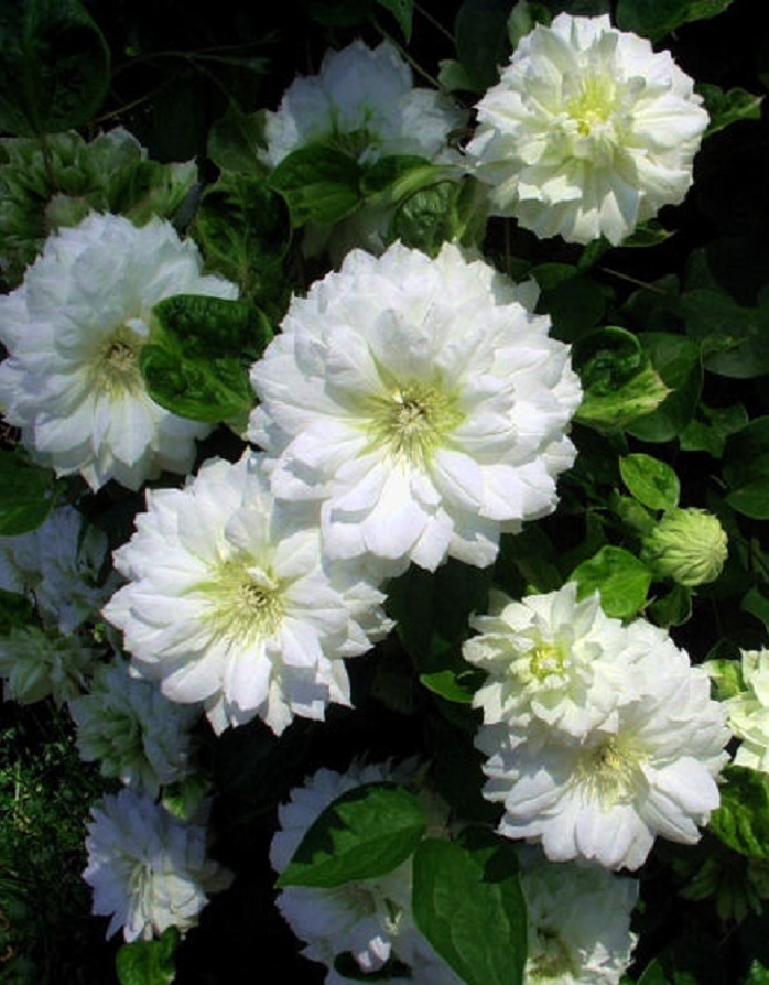 ПрименениеВысаживают его у стен дома, вдоль заборов, рядом с заранее подготовленными каркасными опорами – шпалерами, перголами, арками.Дерево (куст)Довольно-таки мощный, быстро нарастающий куст. Плети поднимаются на 2-3 метровую высоту.ЛистьяУ клематиса Дюшес Оф Эдинбург – листочки сочно–зеленого цвета, цельные.Цветы (соцветия)Клематис имеет пышные цветы цвета пломбира. Шаровидные по форме, состоят они из множества лепестков, весьма хаотично расположенных. Порой нижний ряд чашелистиков полностью пропитан зеленцой разной насыщенности. Цветение практически непрерывное с мая по август, в первой половине преобладают махровые цветки, а после одиночные, образовавшиеся уже на побегах текущего года. Бутоны крупные до 15 см в диаметре.Возраст саженца1 годУсловия выращиванияЛучше растёт и цветёт на солнечных местах.Группа обрезки2