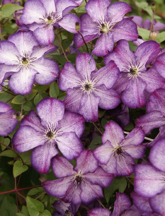Применение,особенностиЦепляется за опоры листовыми черешками. Используется для посадки у беседок, пергол, решёток, сеток и других садовых опор. Особенно хорош для выращивания в небольших садах и контейнерах.КустМноголетняя лиана, достигающая в высоту до 3-3,5 м.Цветы/соцветияЦветков образуется много. Малые и средние, богатые фиолетовые цветы с белыми прожилками, и в центре с белыми полосами. Или окрас цветков можно описать по-другому: белые цветки отмечены фиолетовой каймой, фиолетовыми полосками и часто с отметинами бледно-фиолетового цвета. Размер цветков составляет до 5-9 см в диаметре. Тычинки темно-фиолетового цвета. Любоваться цветением данного клематиса можно с середины лета до начала осени. Цветение обильное. Цветки, а точнее околоцветники, состоят из 6 чашелистиков, взъерошенных и слегка загнутых. Форма околоцветника – чашевидная, с широкими чашелистиками. Этот клематис цветет на побегах текущего года.Возраст саженца1 годУсловия выращиванияОчень важно хорошо укрыть побеги на зиму.Группа обрезки3