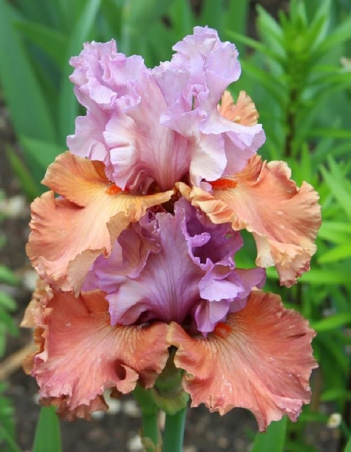 Стандарты сиренево-лиловые. Фолы однородного кофейно-розового цвета с чуть более светлой областью у бородки. Бородка мандариново-оранжевая. Аромат сладкий, ярко выраженный. Высота 90 см. Срок цветения от очень раннего до среднего.