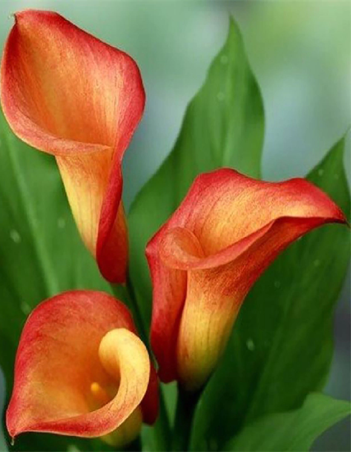 Калла Каптейн Лидо - высота растения 50-60 см, цветок жёлто-красный, диаметр: 5-10 см. Листья крупные, стреловидной формы, блестящие, восковые. Соцветие одиночное на длинном цветоносе.
