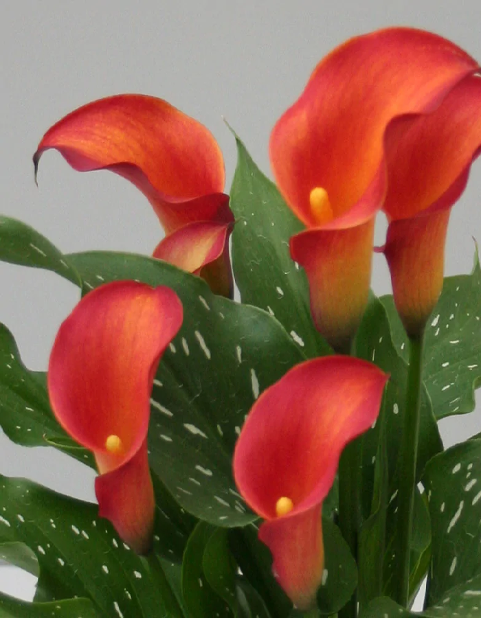 Калла - многолетнее травянистое растение, которое украсит не только сад, но и дом. Цветок в форме свечи, ярко-оранжевый с желто-красными вкраплениями. Листья декоративные, с белым крапом. Высота 50-60см, диаметр цветка: 10 см.