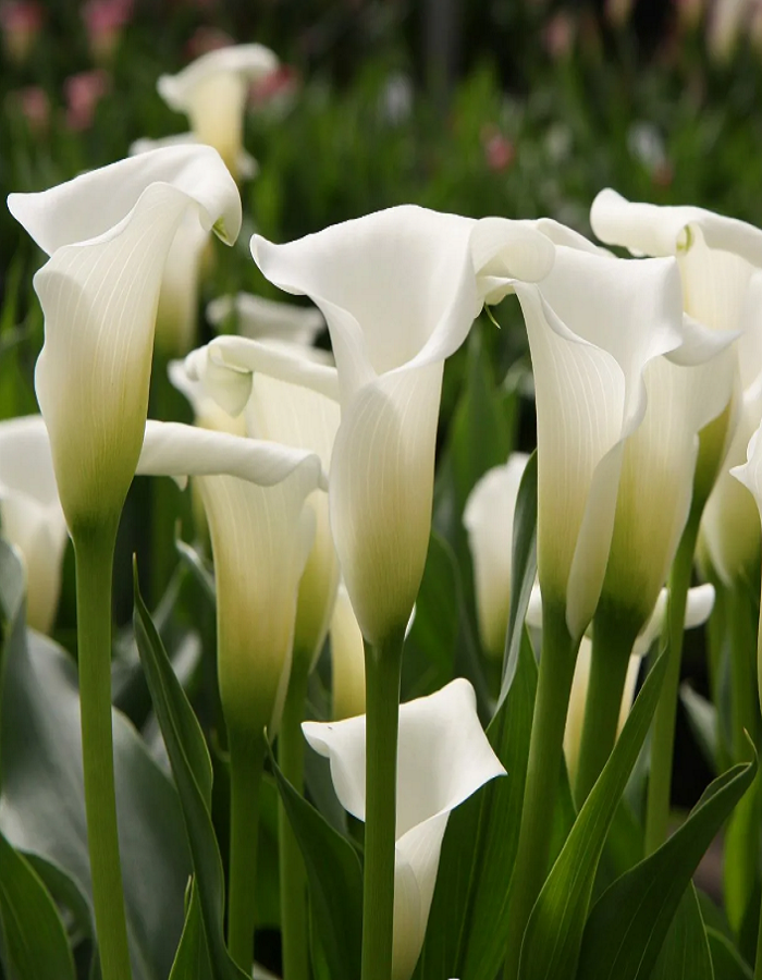 Благодаря своему изысканному белому цвету калла Кристал Клиэр может быть названа настоящей аристократкой среди других сортов. Белоснежные удлиненные цветы, слегка волнистые. Листья темно-зеленые. Эффектна при посадке в бордюрах.