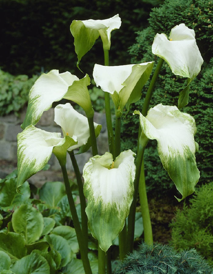 Калла Эфиопика Грин Годдес - многолетнее травянистое растение с клубневидным корневищем. Высота цветоноса до 90 см. Листья зеленые, крупные, сердцевидные, на длинных черешках. Цветок - это ярко-желтое соцветие-початок, обернутое двухцветным воронко-видным листом-покрывалом бело-зеленого цвета. Центр воронки белого цвета, а ближе к острию - зеленого.