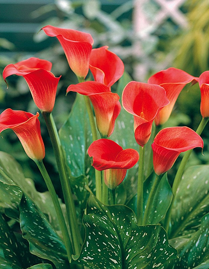 Калла Ред Сокс – комнатное клубневое растение высотой 40-50см. Листья сердцевидной формы, зеленые с белым крапом. Цветонос переходит в трубчатое одно лепестковое соцветие с початком в центре. Изящный и нежный лепесток пурпурно-красного цвета в виде покрывала разворачивается сверху и создает очень декоративный эффект. Калла широко используется для озеленения садов и балконов, а среди комнатных растений пользуется большой популярностью, благодаря роскошным формам.