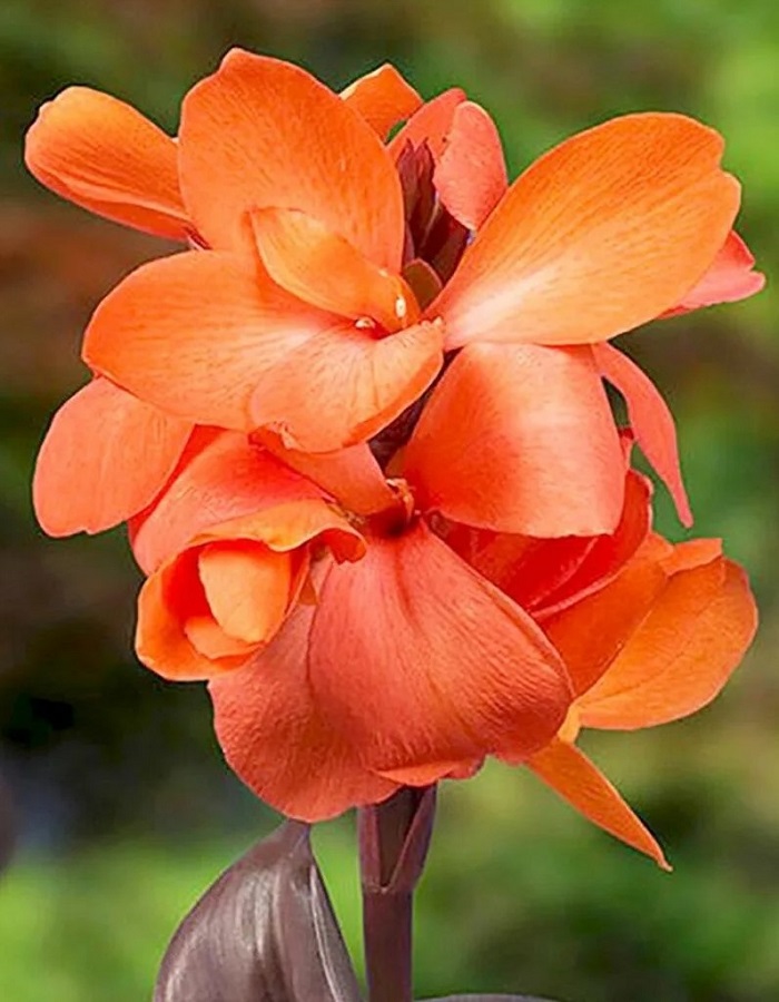 Канна Делибаб -многолетнее, травянистое растение с клубневидными корневищами. Многочисленные орхидеевидные бутоны окрашены в розово-оранжевый оттенок. Лепестки узкие, атласные, не выгорают на солнце.Цветки красные с оранжевым оттенком, которые создают эффект горящего пламени.Листья крупные, эллиптические или овально-продолговатые, заостренные, темные. Размер канны Делибаб не превышает 60 сантиметров, поэтому растение хорошо себя чувствует в горшке или вазоне. Это позволяет высадить луковицы рано весной дома, а с приходом тепла вынести цветок в сад, ускорив наступление цветения.
