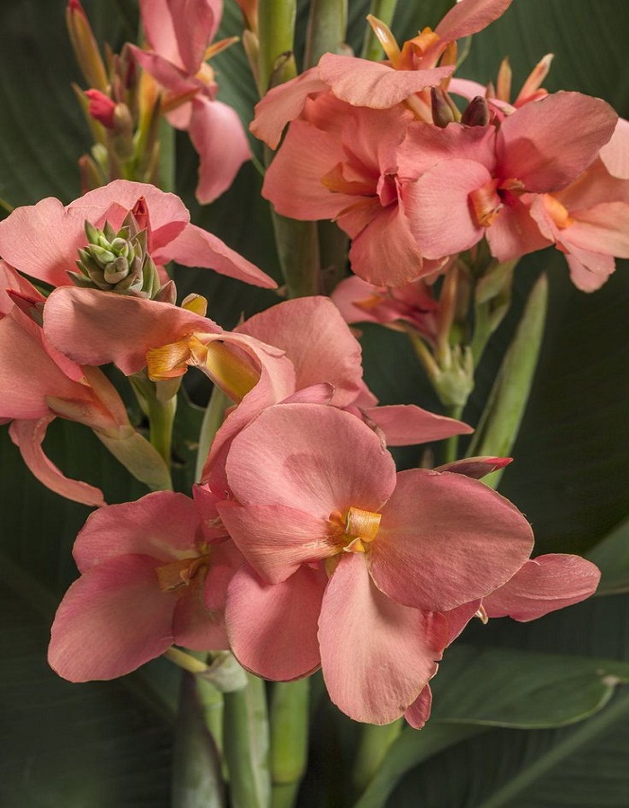 Канна Румяный Персик — многолетнее травянистое растение с прямыми стеблями и мясистыми клубневидными корневищами, высотой 90 см. Листья крупные, мощные, зеленые. Соцветие — кисть, которая начинает цвести с нижнего цветка, потом постепенно поднимается вверх над кустом. Цветки лососево — розовые, диаметром до 12 см.