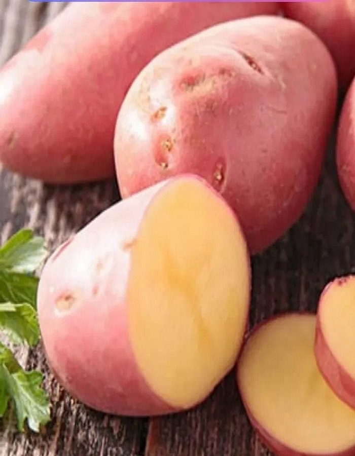 Клубни овальные с глазками средней глубины. Окраска кожуры – красная (розово-красная), мякоти – светло-жёлтая. Количество клубней в кусте: 18-29 (отдельные кусты дают до 35 клубней). Клубни чистые, гладкие.