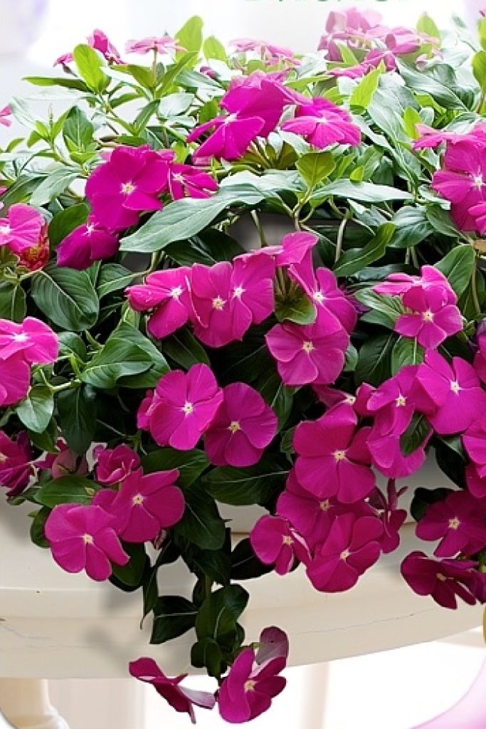 Настоящий ампельный Катарантус, обладающий мощным округлым кустом, идеально подходящий для летних подвесных корзин, смешанных контейнеров и больших ландшафтных клумб. Единственный гибрид, обладающий устойчивостью ко многим штаммам фитофторы. Цветки крупные, диаметром 5-6 см, многочисленные, полностью покрывают растения, сохраняются на протяжении всего сезона. Плотный куст с короткими междоузлиями и красивыми темно-зелеными блестящими листьями.