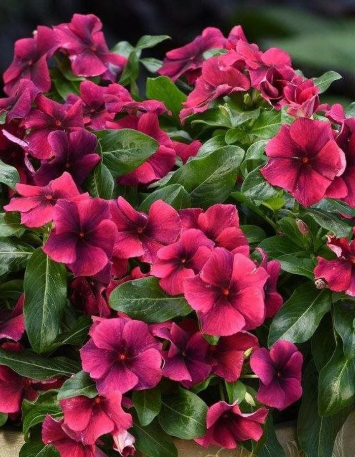 У катарантуса Тату блэк черри вишневые лепестки, дополненные темным «глазком».