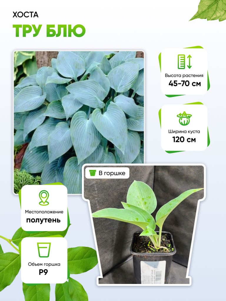 Хоста Тру Блю – травянистое бесстебельное растение с короткими корневищами и шнуровидными корнями, достигает высоты 45-70см. Листья большие, широкосердцевидные, окраска - сине-голубая с тяжелой текстурой. Цветки белые, мелкие, собраны в изящную многоцветковую кисть, которая поднимается над листьями.