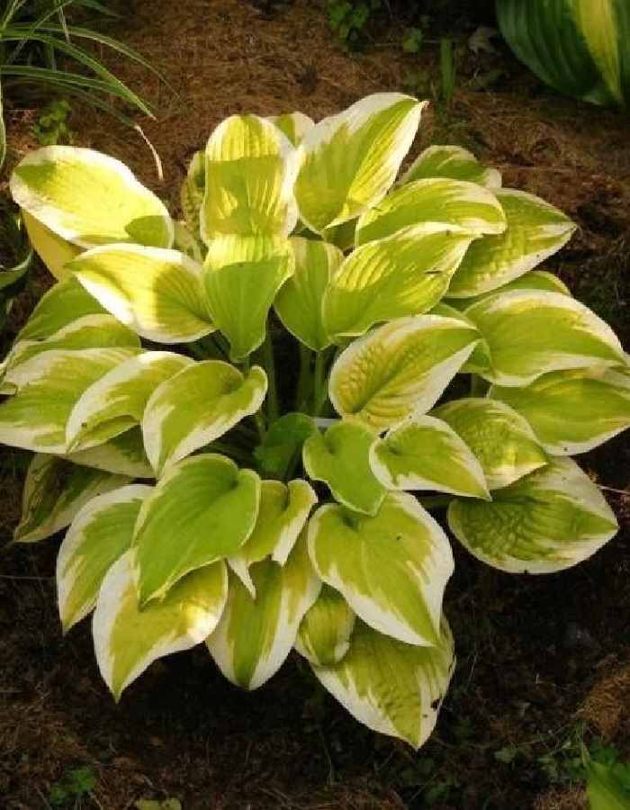 Хоста Дельта Дон - Листья салатно-зелёные с белой каймой по краю листа, к середине лета лист желтеет и становится насыщенно- жёлтым с яркой белой каймой, особенно во второй половине и ближе к осени интенсивность золота увеличивается. По форме листья овально- продолговатые, рифлёные, с выраженными жилками. В тенистых местах и на кислой почве желтизна проявляется гораздо слабее. Цветы светлые. Высота до 40-50 см. Ширина куста до 80 см. Период цветения июль. Зона зимостойкости: 3 (-40 ° С).