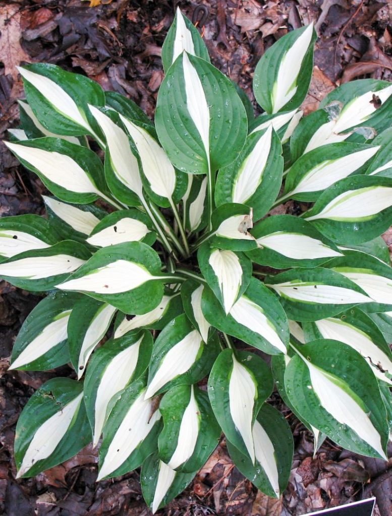 Данная хоста являет собой мощный и нарядный куст, относящийся к категории среднеразмерных. Высота растения составляет 40 сантиметров, ширина – 60 см. Крона практически округлая, побеги имеют дуговидную конфигурацию. Культура быстро разрастается в ширину. Ланцетовидные широкие листья являются слегка скрученными. Ширина пластин составляет 14 сантиметров, длина – 18. Листочки плотные, морщинистые, с выраженным жилкованием и волнистыми краями. Окрас пестрый, контрастный: сердцевина белоснежная, а вокруг нее присутствуют яркие зеленые тона. Расцветка сохраняется на протяжении всего сезона. Кроме того, на вариегатных листьях присутствует налет сизого оттенка.