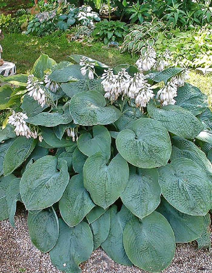 Хоста Элеганс - Роскошная крупная голубая хоста с пузырчатыми листьями, листовая пластина длиной до 36 см, голубая окраска более интенсивна в тени. Разрастается медленно. Размеры листа и "морщинистость" усиливаются с возрастом. Цветы восковые, почти белые с едва сиреневатым оттенком. Соцветие компактное, плотное, как у гиацинта, цветонос почти не возвышается над листьями. Зацветает в конце июня (раньше, чем остальные хосты). Очень эффектная хоста. Высота куста 70 см, ширина 90 -120 см. Зона зимостойкости: 4 (-35 ° С)