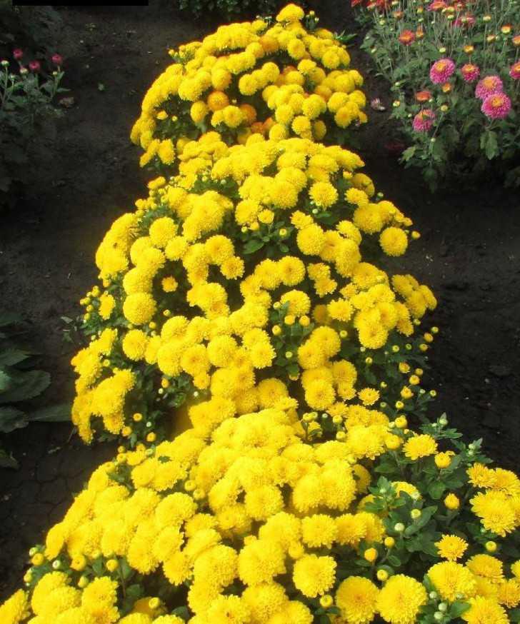 ПрименениеПодходит для горшечного выращивания, отлично смотрится в бордюрных посадках.Дерево (куст)Эффектная шаровидная хризантема – плотный компактный и низкорослый цветущий «шар» густо усыпанный желтыми цветками. Побеги голые, невысокие, достигающие максимум 40 см. Куст не нуждается в формирующей обрезке, так как его форма закреплена на генетическом уровне.Цветы (соцветия)Цветы до 3 см.ЗимостойкостьЗимостойкость до -18° сВозраст саженца1 годУсловия выращиванияХризантемы предпочитают солнечное, защищенное от ветра место. Большинство сортов хризантем, выращиваемых в открытом грунте, относятся к мелко- и среднецветковым. Их формирование в основном заключается в прищипке побегов, нарушающих форму куста, и в удалении бутонов, появляющихся весной и в начале лета. На зиму хризантемы укрывают с целью сохранения прикорневой поросли. Для этого обрезают кусты на высоту 15 — 20 см над уровнем почвы сразу после цветения. В середине октября кустики окучивают землей, торфом, компостом или биогумусом, а сверху прикрывают опавшей листвой, укрывным материалом. Весной, как спадут морозы, укрытие убирают.