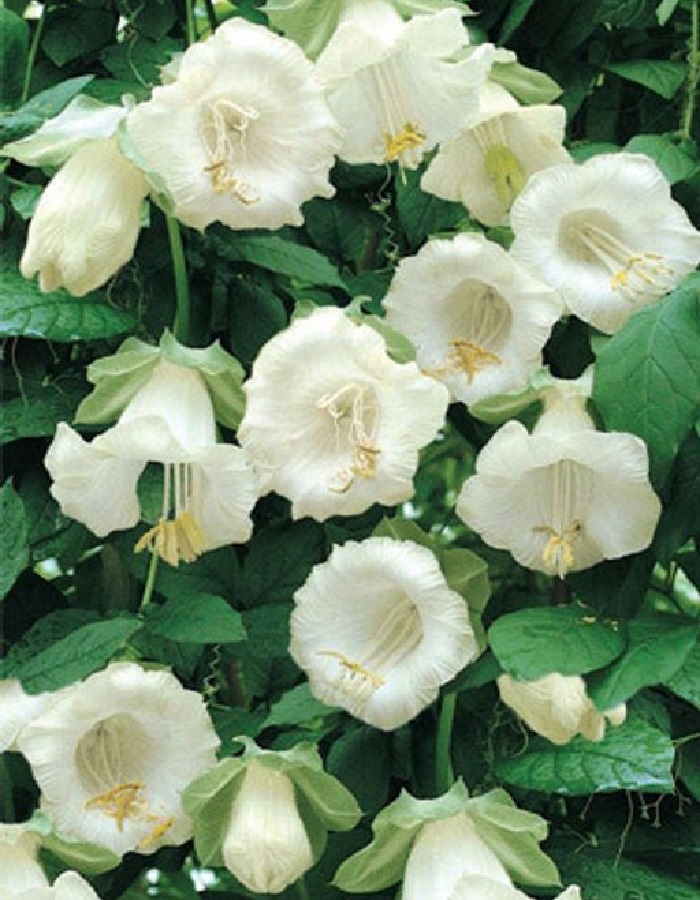 Вьющаяся лиана с перистыми, морщинистыми листьями, которые оканчиваются разветвлённым усиком, при помощи которого растение закрепляется на опоре. Цветки нежного белого цвета, колокольчатые, 6–8 см в диаметре, с длинными тычинками и пестиком, выходящими наружу цветка. Цветёт с июля до заморозков. Используется для вертикального озеленения, для декорации фасадов, веранд, беседок, шпалер, устройства фестонов.