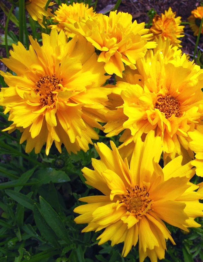 Кореопсис - многолетнее декоративное растение из семейства Астровые высотой 35-45 см. Цветет с июля по сентябрь. Соцветия крупные (6-8 см в диаметре), махровые, ярко-желтой окраски. Используют для посадки сборных цветников, группами на газонах, в качестве фоновых растений, очень хороши для срезки, в воде стоят дольше недели.