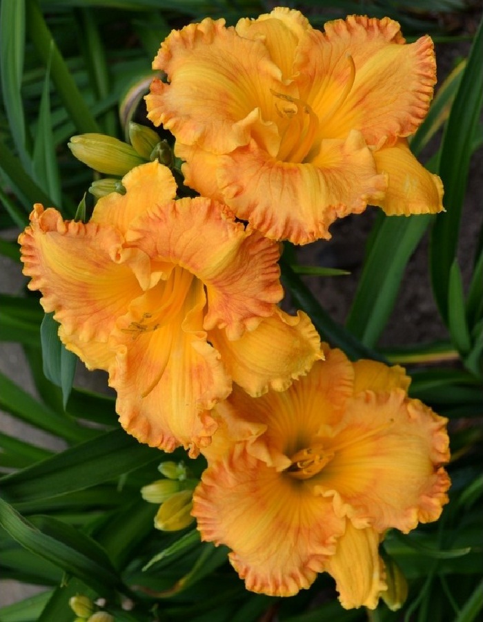 Лилейник Оранж Нассау - корневищное растение высотой 50-60см. Его мечевидно изогнутые листья образуют плотные кусты. Цветки по форме похожи на цветки лилий - воронковидные, с небольшой трубкой, собраны в раскидистые соцветия. По окраске цветки желто-оранжевые с гофрированными краями, диаметром до 15см. Цветение с июня по август. Используют в групповых посадках, рабатках, миксбордерах, у водоемов, а также одиночно на газоне.