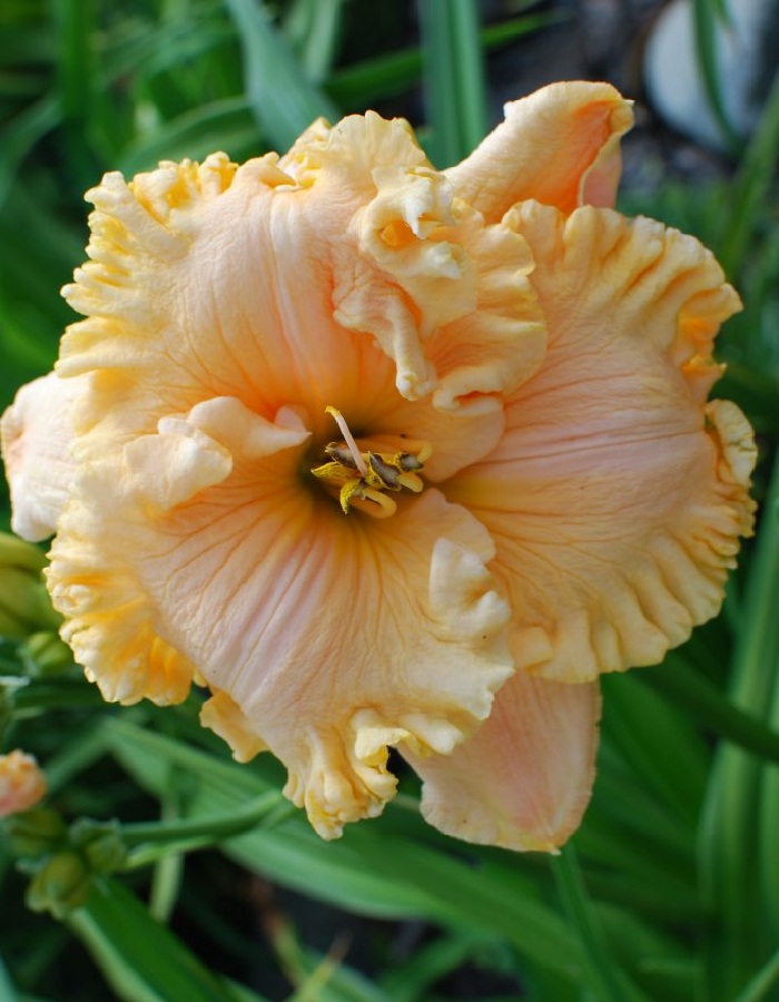 Лилейник Энчентед Форест - корневищное растение высотой до 70см. Его мечевидно изогнутые листья образуют плотные кусты. Цветки по форме похожи на цветки лилий - воронковидные, с небольшой трубкой, собраны в раскидистые соцветия. По окраске цветки цвета спелой дыни с золотистым гофрированным краем, диаметром до 15см. Цветение с июля по август. Используют в групповых посадках, рабатках, миксбордерах, у водоемов, а также одиночно на газоне.