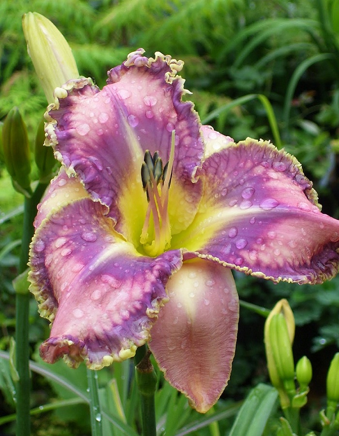 Лилейник Милдред Митчел - корневищное растение высотой 55см. Его мечевидно изогнутые листья образуют плотные кусты. Цветки по форме похожи на цветки лилий - воронковидные, с небольшой трубкой, собраны в раскидистые соцветия. По окраске цветки лавандовые с более темным глазком, каймой и желтым горлом, диаметром до 16см. Цветение с июля по август. Используют в групповых посадках, рабатках, миксбордерах, у водоемов, а также одиночно на газоне.