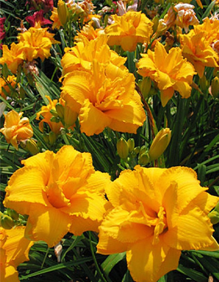 Лилейник Кондилла - корневищное растение высотой 50-60см. Его мечевидно изогнутые листья образуют плотные кусты. Цветки махровые, по форме похожи на цветки лилий - воронковидные, с небольшой трубкой, собраны в раскидистые соцветия. По окраске цветки золотисто-желтые диаметром до 12см. Цветение с июня по август. Используют в групповых посадках, рабатках, миксбордерах, у водоемов, а также одиночно на газоне.