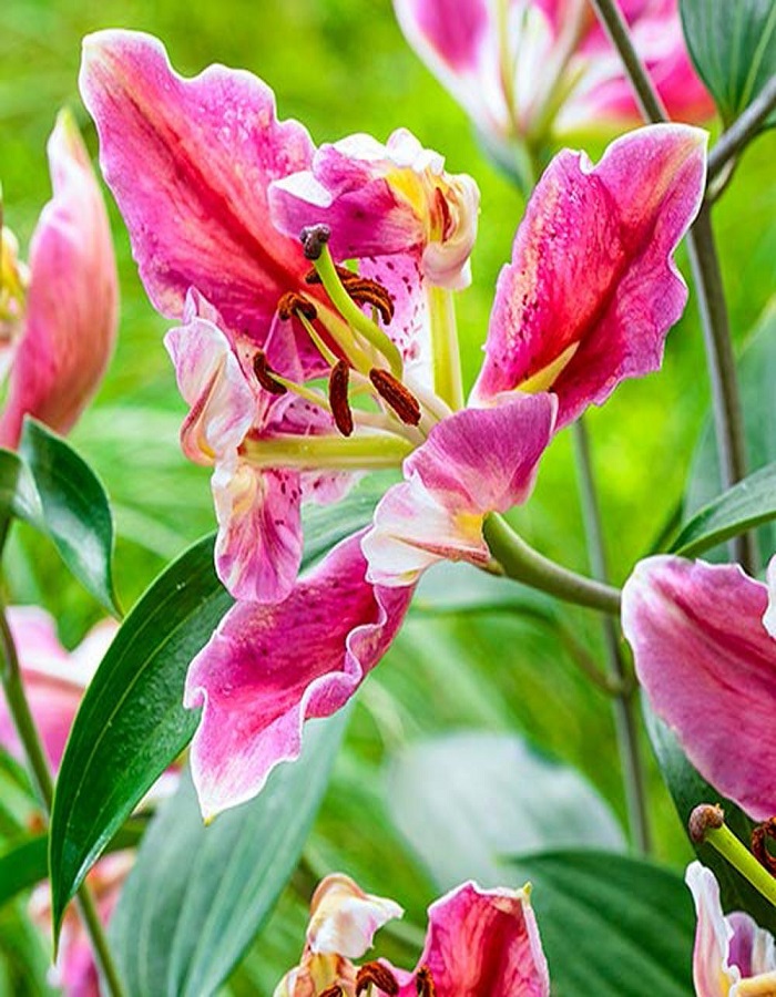 Совершенно новый тип лилии. Эксклюзивные, экстраординарные и сильные - это несколько подходящих ключевых слов. Лилия Пэррот Пинк Кариба выглядит настолько экзотично, что не сразу понятно, что это лилия, а не какое-то тропическое растение. Этот сорт был зарегистрирован в 2014 году и сразу произвел настоящий фурор на рынке. Ведь до этого никто не видел ничего подобного. Необычна как форма цветка с загнутыми вовнутрь «попугайными» лепестками, так и его окраска с необычными красными переливами на ярко-розовом фоне. Из середины цветков выходят плотные ярко-зеленые лучи, прекрасно сочетающиеся с зелеными тычинками. лилии Пэррот Пинк Кариба 90-120см, размер цветка 10-15см, аромат сильный, цветение июль/август.