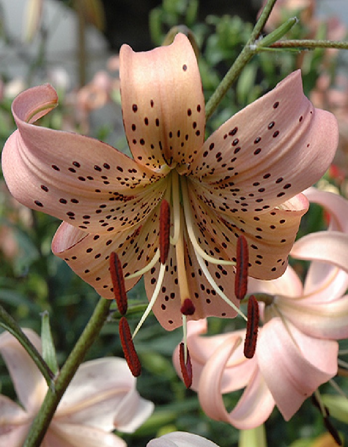 Лилия ПИНК ДЖИАНТ - цветки светло-розового окраса, покрыты веснушками, с изящно загнутыми лепестками. Лилия Pink Giant (Пинк Гиант) – чрезвычайно прочная и очень нарядная. Цветки достигат до 15 см в диаметре, и «смотрят» вниз. Каждый цветок чалмовидной формы. Лепестки и чашелистики атласной текстуры, с эффектно подкрученными концами. Цветки собраны в соцветия по несколько штук (от 12 до 20). Пыльныки рыжего окраса. Аромат отсутствует. Листья толстые, блестящие, продолговатые, насыщенно-зеленого окраса. Цветет этот сорт рано: с середины июня. Отличается очень высокой морозостойкостью: выдерживает понижение температуры до –40 ° С. Высота растения составляет 90-150 см.