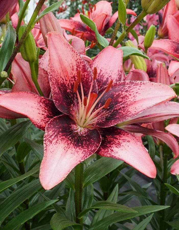 Лилия Purple Dream - это яркий гибрид высотой до 100 см. Цветки имеют насыщенно-розовый окрас с темно-пурпурным крапом. Они практически не пахнут и не образуют пыльцу, благодаря чему подойдут для разведения аллергикам и для составления букетов.