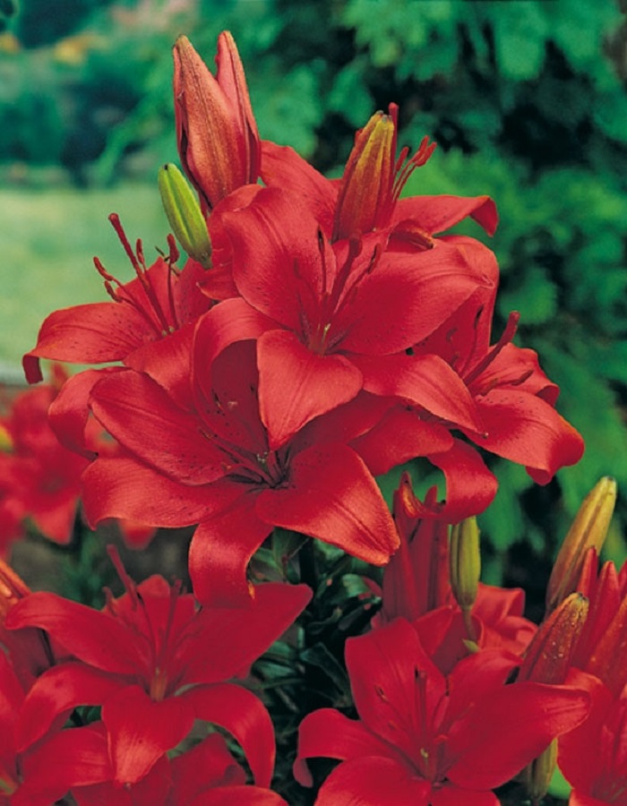 Лилия Гран Парадисо (Азиатский гибрид) – луковичное растение высотой до 120см. Стебли светло зеленые с 7-9 цветками, листья очередные. Направленные вверх цветки – ярко-красные, диаметром до 15см, без аромата. Цветет в июне – июле. Используют в групповых посадках, миксбордерах, клумбах и на срезку.