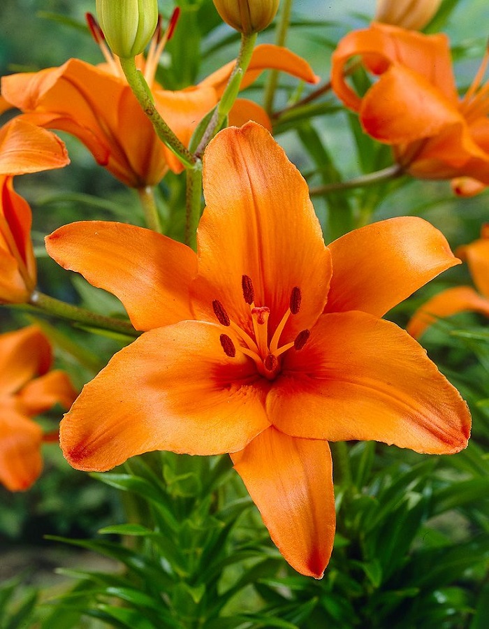 Лилия Брунелло (Азиатский гибрид) — луковичное растение высотой 100 см. Стебли светло зеленые с 7-9 цветками, листья очередные. Направленные вверх цветки — насыщенно оранжевые, диаметром до 17 см, с нежным ароматом. Цветет в июне — июле. Используют в групповых посадках, миксбордерах, клумбах и на срезку.