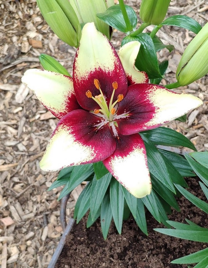 Curitiba - это двухцветная азиатская раноцветущая лилия. Jan de Vries (Нидерланды). Цветки этой лилии распускаются одними из первых, в начале лета. Сорт считается карликовым, высота его стеблей не превышает 60 см, поэтому он прекрасно подойдет для разведения в горшках и теплицах. Цветки имеют средний размер, лепестки двухцветные: посредине каждого бордового лепестка есть кремовое пятно. Лилия очень морозостойкая, выдерживает температуру до –40 ° С.
