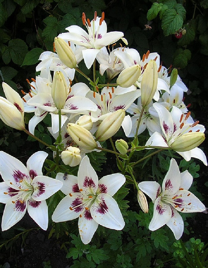 Лилия Центерфолд (Азиатский гибрид) – луковичное растение высотой 90-100см. Стебли светло зеленые с 7-9 цветками, листья очередные. Направленные вверх цветки –белоснежные с пурпурными штрихами и крапом по центру, диаметром 15см, без аромата. Цветет в июне – июле. Используют в групповых посадках, миксбордерах, клумбах и на срезку.