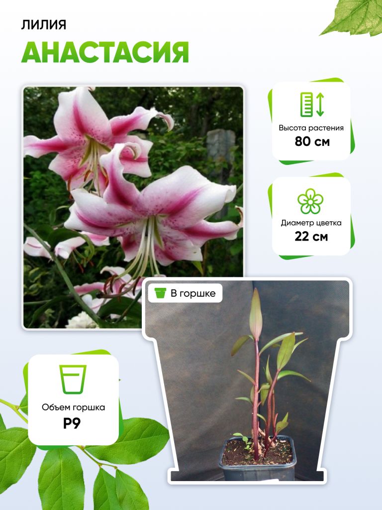 Лилия Анастасия (ОТ- гибрид) – луковичное растение высотой 80см. Имеет прочные светло-зеленые стебли с 5-8 цветками и очередные листья. Цветки воронковидные, направлены в стороны, нежно розовые с малиновыми прожилками и крапом, диаметром до 22см, ароматные. Цветет в июле-августе.