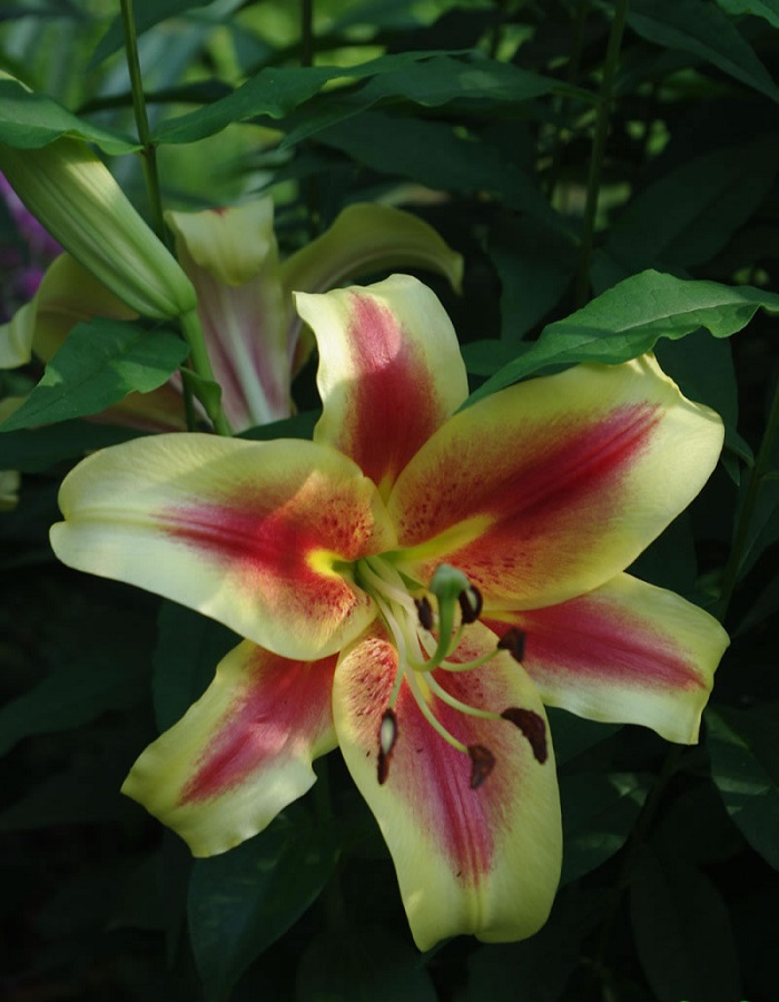 Лилия Шокинг относится к виду (ОТ) гибридов. Цветки диаметром 21 см, пламенно-желтые, с ярко-красными мазками в центре лепестка, растущие вверх и в сторону. Зацветает в июне-июле, имеет нежный аромат. Высота растения 120 см.