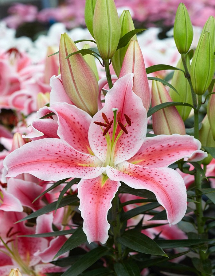 Лилия восточная Rapid Romance (Рапид Романс) - цветок ярко-розовый с белой каймой и красным крапом. Сорт низкорослый, компактный. Высота 50-60см. 3-5 бутонов, цветок диаметром 22см. Зацветает через 70--80 дней!