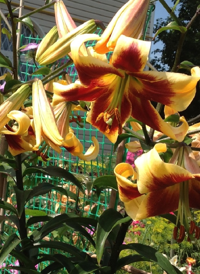 Высокорослое растение с прямостоячим стеблем вырастает до 120-180 см. Листовые пластины зелёного цвета. Кустик одновременно может быть украшен 30 распустившимися бутонами. Цветы крупные (16-18 см), воронкообразной формы, направлены в разные стороны. Они немахровые, лепестки закручиваются назад. Окрас насыщенный, абрикосово-персиковый (в начале роспуска), затем становится ярким винно-красным или цвета красного дерева с лососевыми краями. В полном роспуске концы лепестков золотисто-жёлтые. На длинных зелёных тычинках расположены оранжево-коричневые пыльники. Аромат средней интенсивности.
