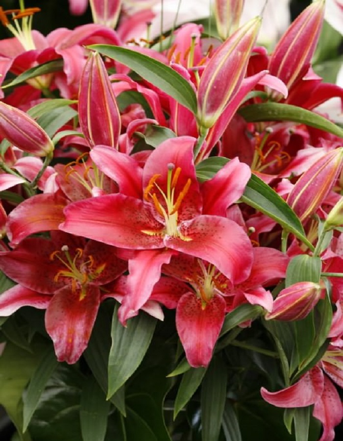 Лилия Монтесума (Восточный гибрид) – луковичное растение высотой 120-130см. Стебли светло зеленые с 5-8 цветками, листья очередные. Направленные вверх цветки – пурпурно-красные с крапом, диаметром до 27см, с насыщенным ароматом. Цветет в июле-сентябре. Используют в групповых посадках, миксбордерах, клумбах и на срезку.