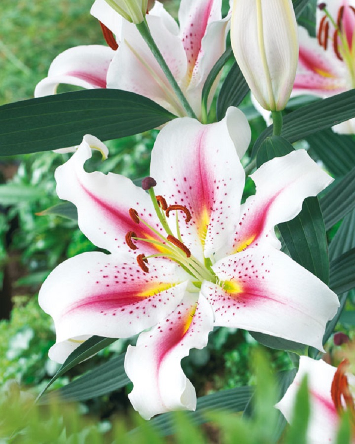Лилия Плейтайм (Восточный гибрид) – луковичное растение высотой 120см. Стебли светло зеленые с 5-8 цветками, листья очередные. Направленные вверх цветки – белые с желто-розовыми лучами по центру и малиновым крапом, диаметром до 20см, с сильным ароматом. Цветет в июле-сентябре. Используют в групповых посадках, миксбордерах, клумбах и на срезку.