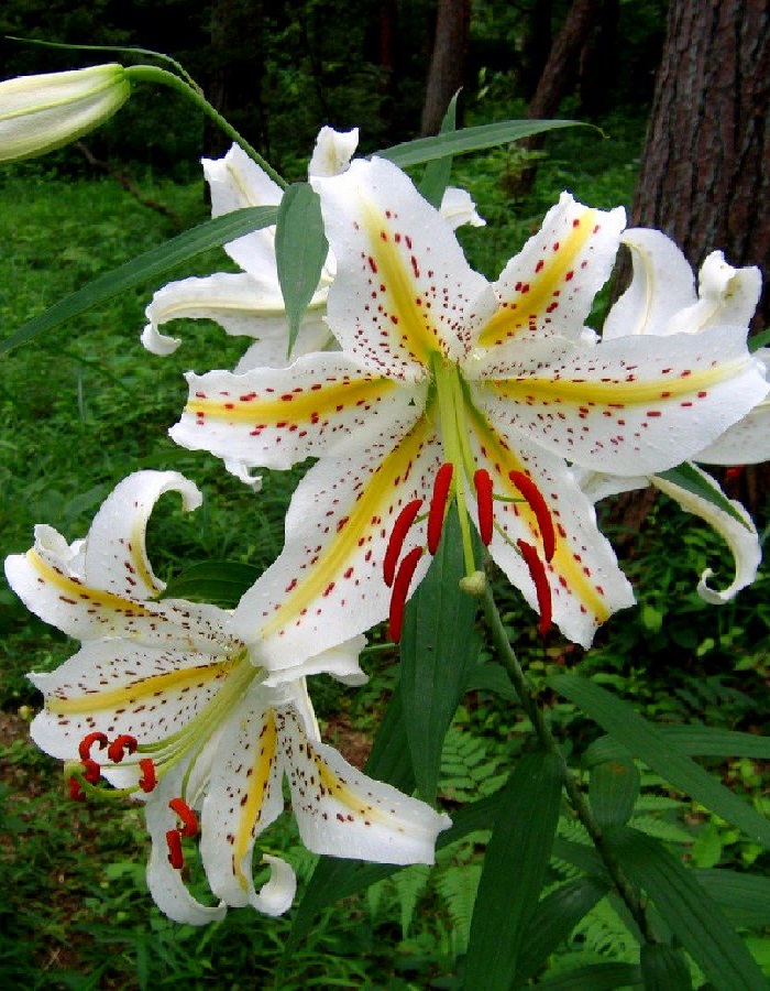 Лилия  Голд Бенд (Восточный гибрид) – луковичное растение  высотой  до 100см. Стебли светло зеленые с 5-8 цветками, листья очередные. Направленные вверх цветки – белоснежные с желтыми полосами и малиновым крапом, диаметром до 20см, с насыщенным ароматом. Цветет в июле-сентябре. Используют в групповых посадках, миксбордерах, клумбах и на срезку.